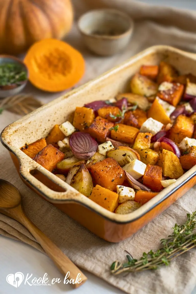 Makkelijk recept: traybake met pompoen, krieltjes en feta (binnen 30 minuten)