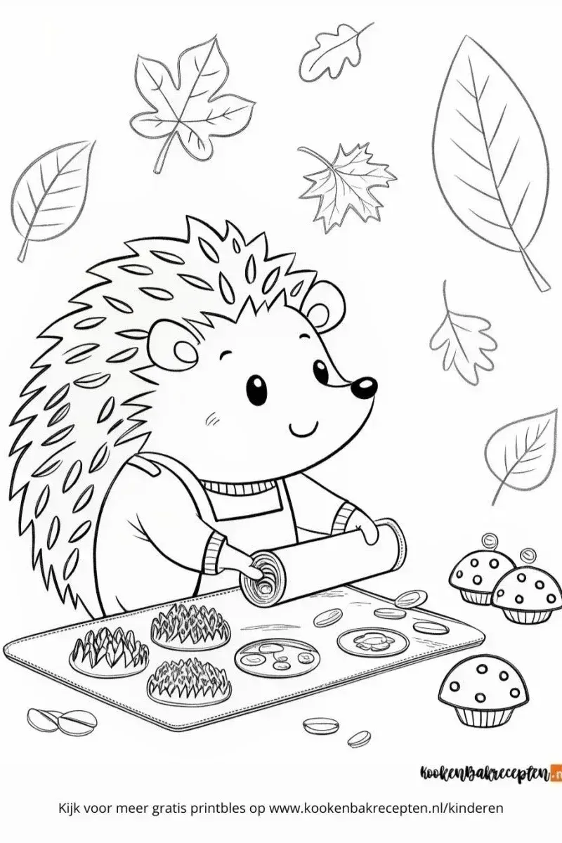 Het is herfst en onze vrolijke egel is druk bezig in de keuken! Ze had zin in koekjes bakken. Zij rolt het deeg uit en maakt lekkere hapjes. Geef de egel, de blaadjes en de koekjes mooie kleuren en maak er een gezellig herfstplaatje van!